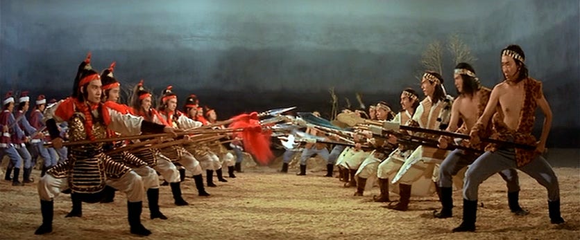 To make a long story short, it does not go well: the Yangs are betrayed by the Chinese general Pan Mei, like lambs to the slaughter. To rub salt in the wound, the Liaos have developed a whip-style staff to nullify the Yangs’ spear technique. All but two of them die, Fifth Yang (Liu) and Sixth Yang (Sheng). Initially, Sheng was meant to be the star, but was replaced due to his death; his scenes remain in the movie, and they actually do carry significant weight, but much of his arc is folded into Liu’s character, namely the PTSD aspects.